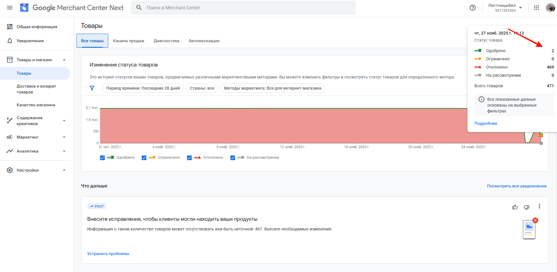 Итак, идем в Google Merchants и видим, что на самом деле товары перестали быть активными и имеют статус "Отклонено".