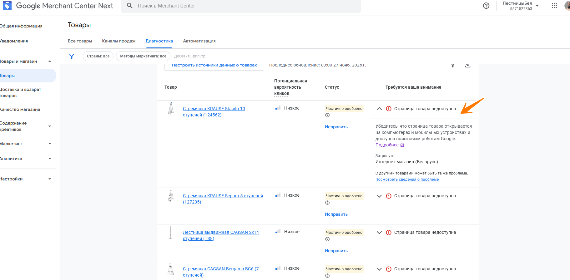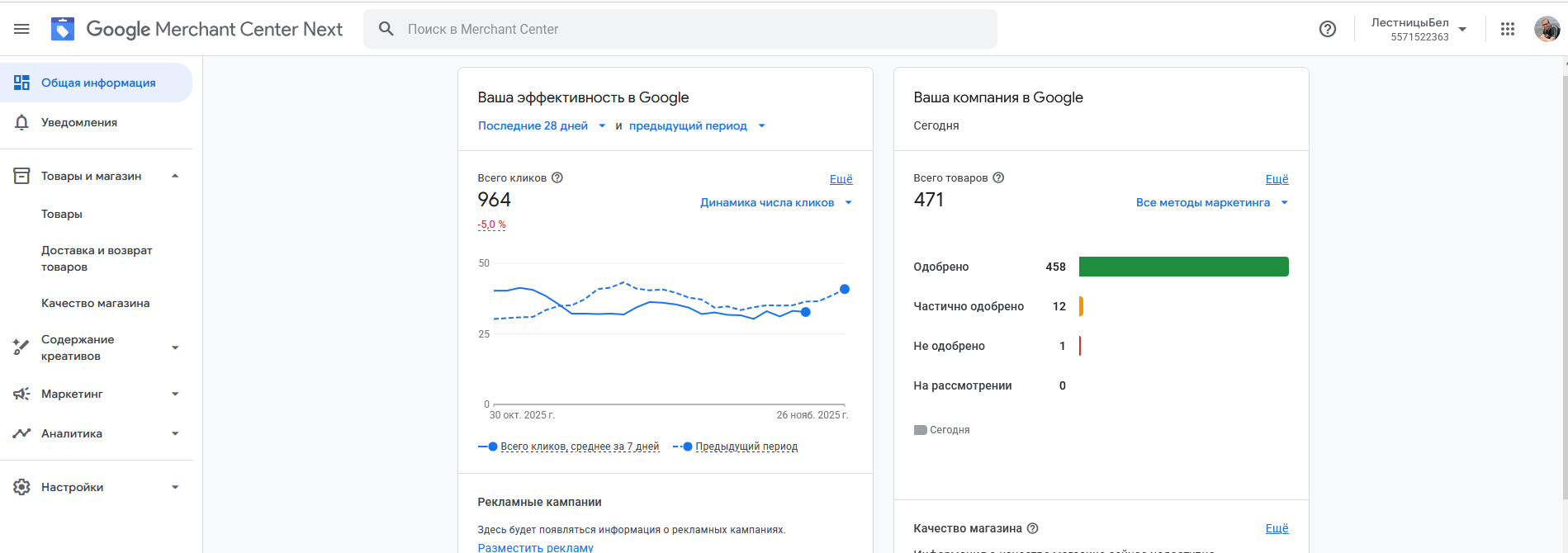Осталось вернуться в Google Merchants, чтобы там отправить товары на переобход и вуаля